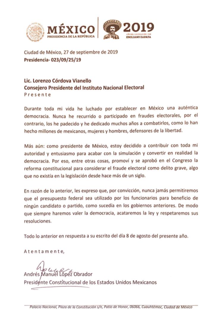 El presidente Andrés Manuel López Obrador garantizó al consejero presidente del Instituto Nacional Electoral (INE), Lorenzo Córdova a través de una carta, que está decidido a luchar con toda su “autoridad y entusiasmo” para que no se repitan los fraudes electorales en el país.