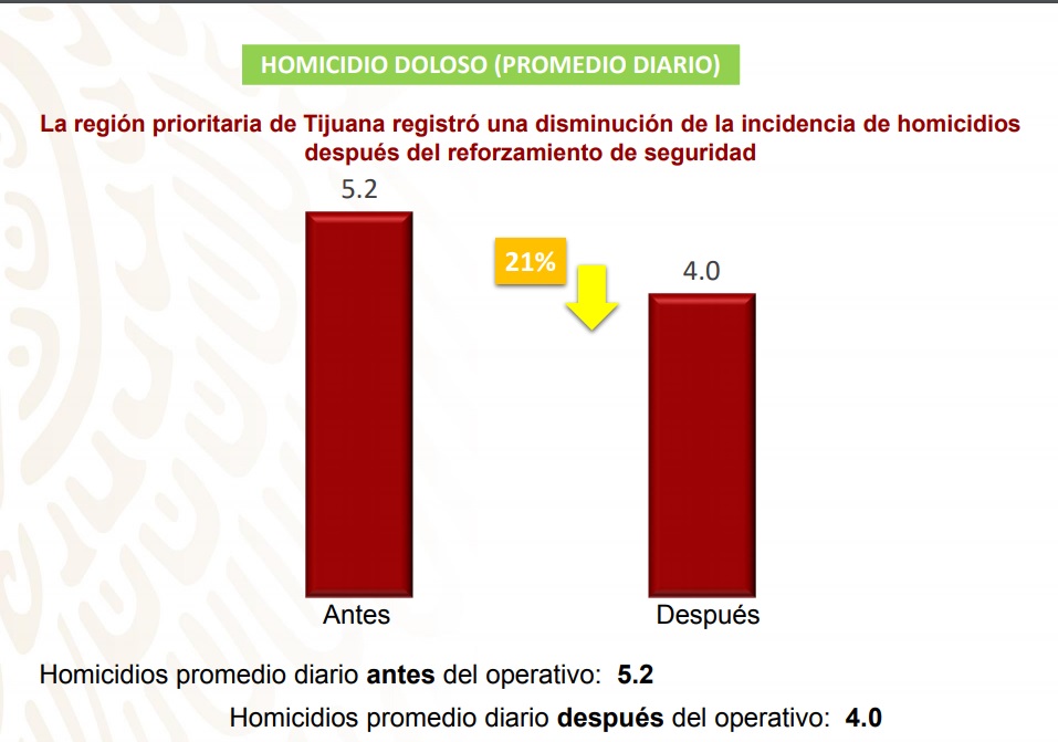 Destacó que en Tijuana se ha registrado una reducción importante de asesinatos, ya que “antes de la estrategia teníamos un promedio de 5.2 homicidios y hubo una reducción del 21 por ciento, quedando al 4.0 más o menos de homicidios promedio diario”.