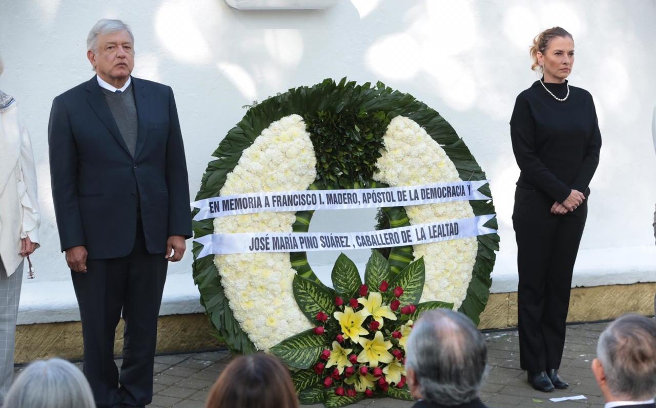 El presidente electo colocó una ofrenda floral en memoria del ex presidente Francisco I. Madero, y el vicepresidente, José María Pino Suárez, en el parque Alameda Ánfora, a un costado de la antigua penitenciaría, en el Palacio de Lecumberri donde ambos fueron asesinados en 1913, durante la Decena Trágica.