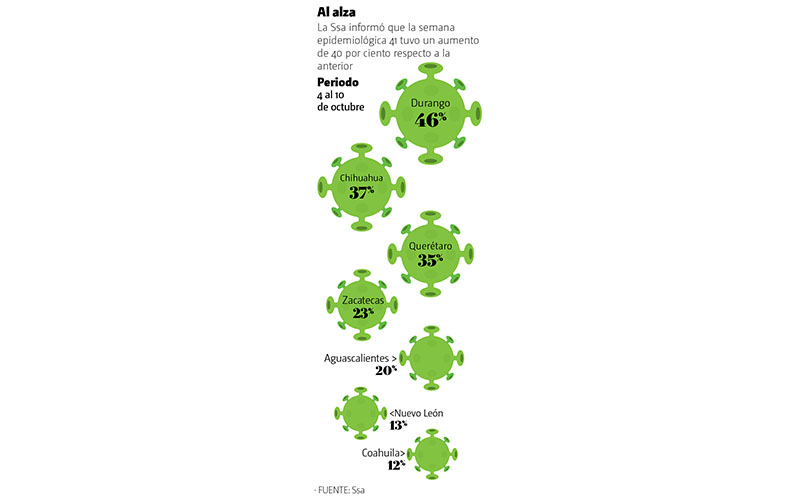 Su homólogo de Zacatecas, Alejandro Tello, informó que el estado pasó de 456 contagios en la cuarta semana de septiembre a 990 en la tercera de octubre, un promedio de 90 diarios.
