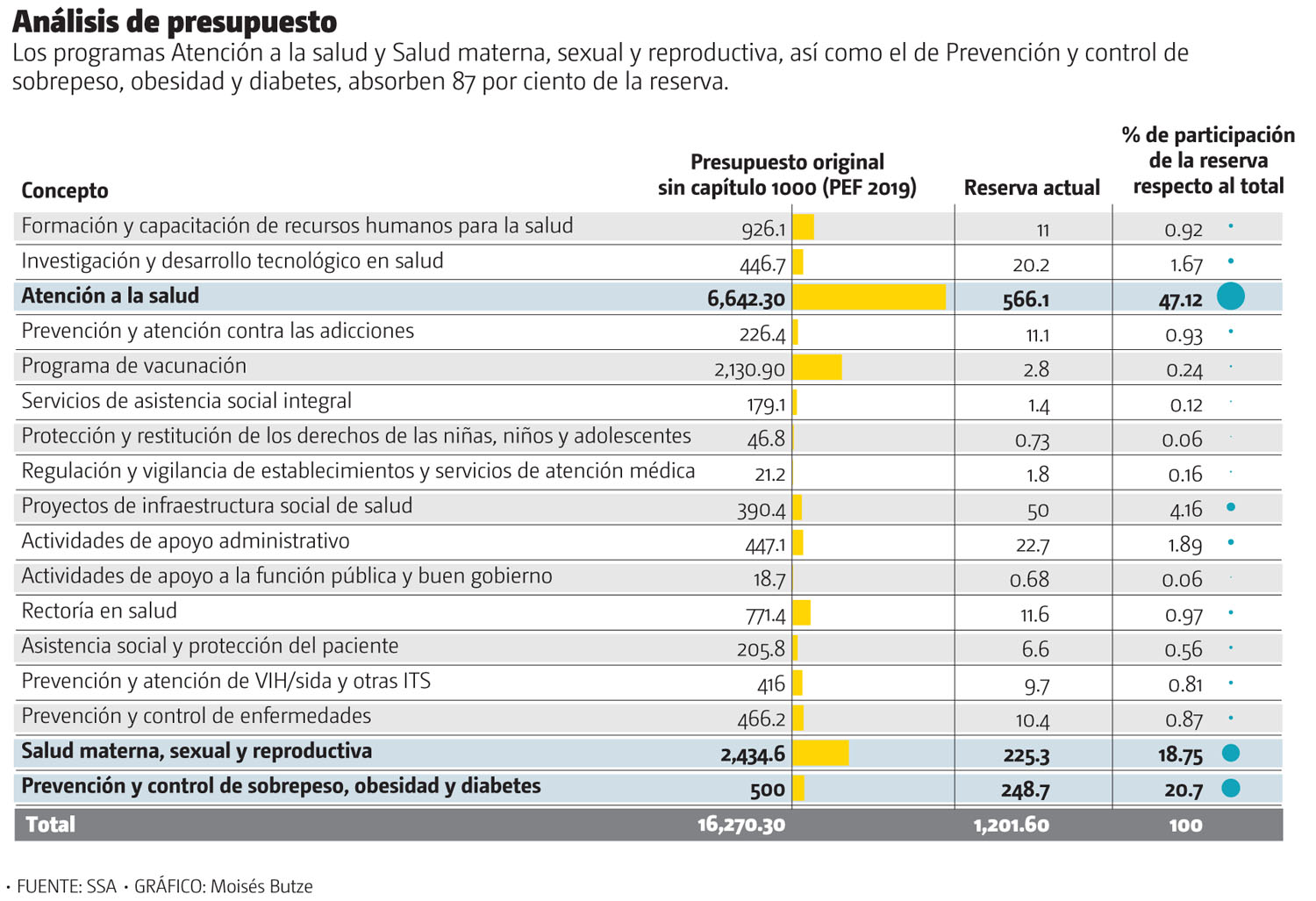 Según el “Análisis sobre la implicación del presupuesto de operación 2019 reservado al Ramo 12 Salud”, elaborado por la Unidad de Administración y Finanzas de la Secretaría de Salud, solo los programas presupuestales Atención a la Salud (566.1 millones de pesos), Salud Materna, Sexual y Reproductiva (225.3 millones) y Prevención y Control de Sobrepeso, Obesidad y Diabetes (248.7 millones) concentran 87 por ciento de los recursos “congelados”.