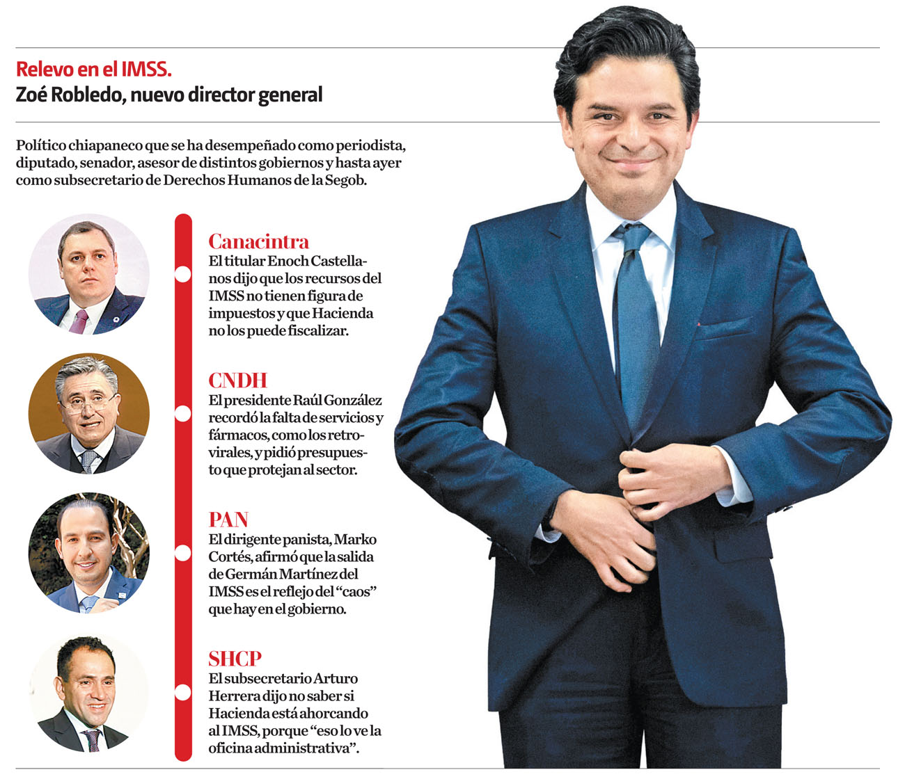 López Obrador anunció que Zoé Robledo es el nuevo director general del IMSS en sustitución de Germán Martínez. Afirmó que tiene “toda su confianza” y que en próximos días nombrarán a su sustituto en Gobernación.