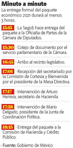 Bajo estrictas medidas sanitarias por la pandemia y acompañado por una reducida comitiva, el secretario de Hacienda, Arturo Herrera, entregará hoy el paquete económico 2021 a la Cámara de Diputados en un acto con duración aproximada de 35 minutos.
