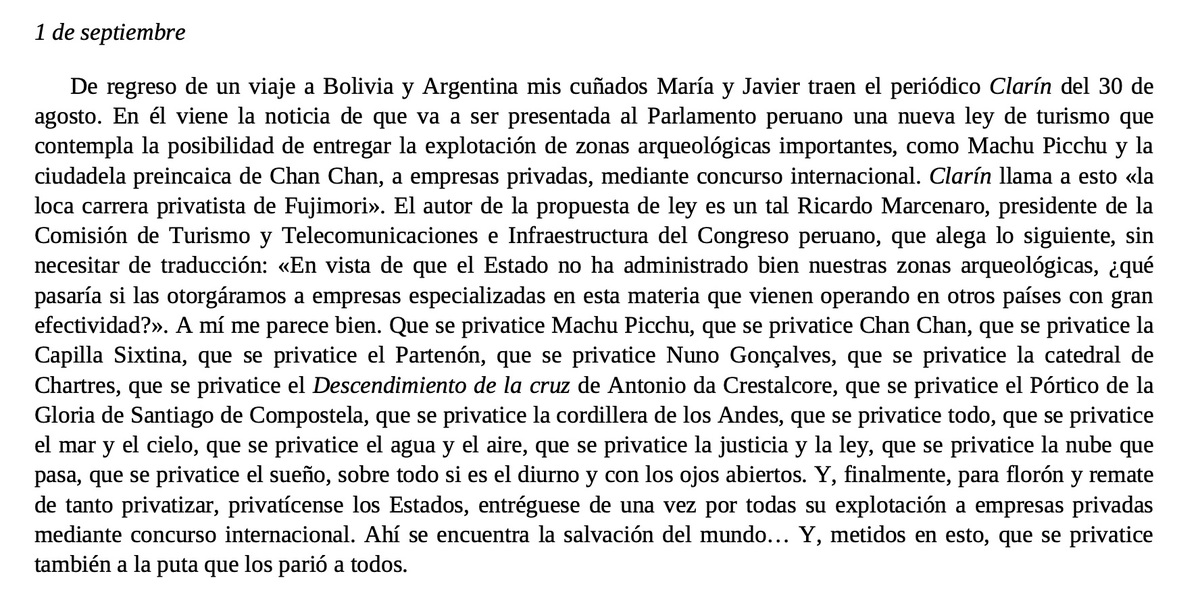 Referente al tema de la privatización, Saramago habla al respecto bajo la fecha del 1 de septiembre, recordando una nota informativa sobre la posibilidad de entregar zonas arqueológicas de Perú a la industria privada mediante un concurso internacional. A continuación, te compartimos el extracto del libro.