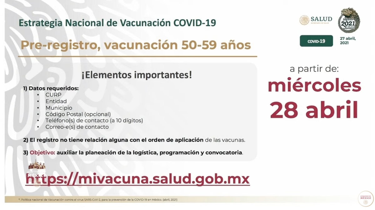 El gobierno anunció el inicio de vacunación contra covid-19 de personas de 50 a 59 años a partir de la primera semana de mayo, por lo que el registro se abrirá mañana en la página mivacuna.salud.gob.mx, pero no representará el orden de aplicación.