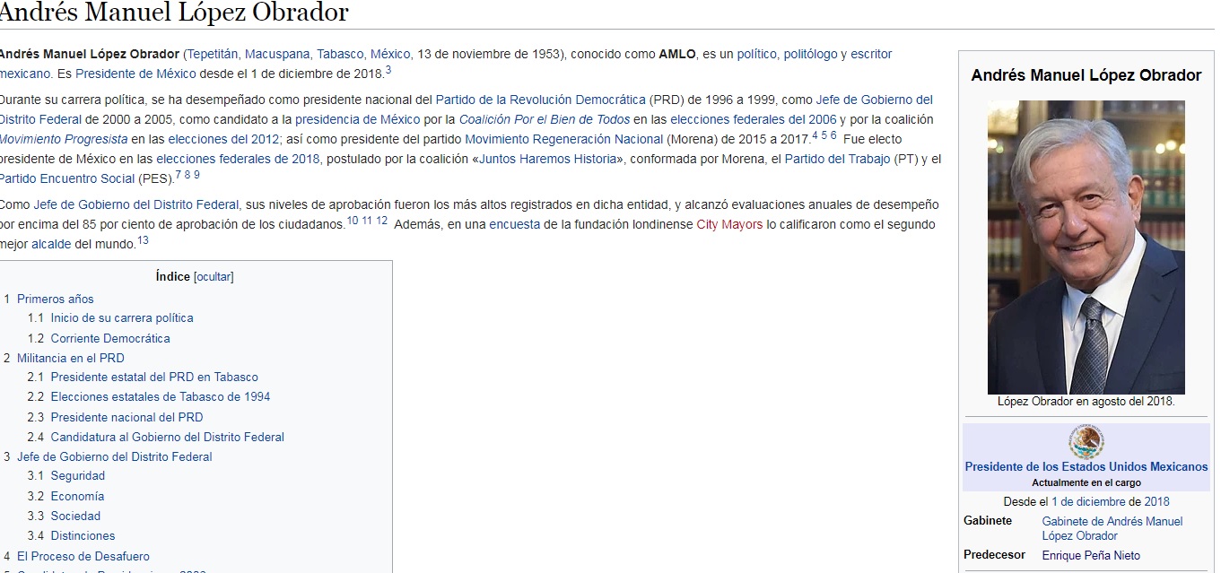 La enciclopedia en línea colocó ya la imagen del morenista en su biografía, que lo describe como Presidente de los Estados Unidos Mexicanos, sucesor de Enrique Peña Nieto.