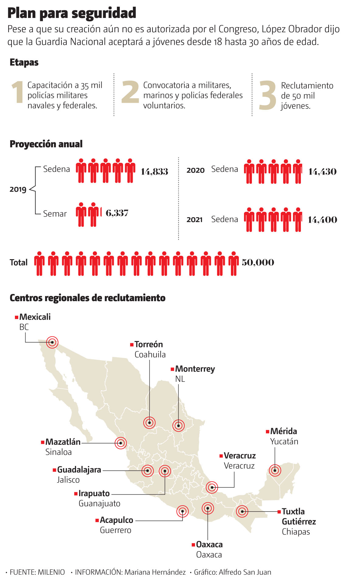 Destacó que se hizo la invitación a que militares marinos y policías en activo soliciten su integración a esta institución y la convocatoria que se lanzó ayer es para jóvenes que busquen sumarse, por lo que de 2019 a 2021 se reclutará a 50 mil jóvenes, de manera paulatina; de ellos, se pretende captar 21 mil 170 elementos, destinados bajo responsabilidad de la Sedena.