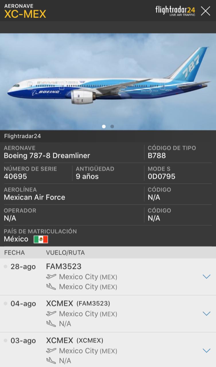 La plataforma de rastreo Flightradar24 detalló que la aeronave partió a las 09:31 horas del que fuera el Hangar Presidencial, hoy la base aérea militar 19, en el Aeropuerto Internacional de la Ciudad de México (AICM).
