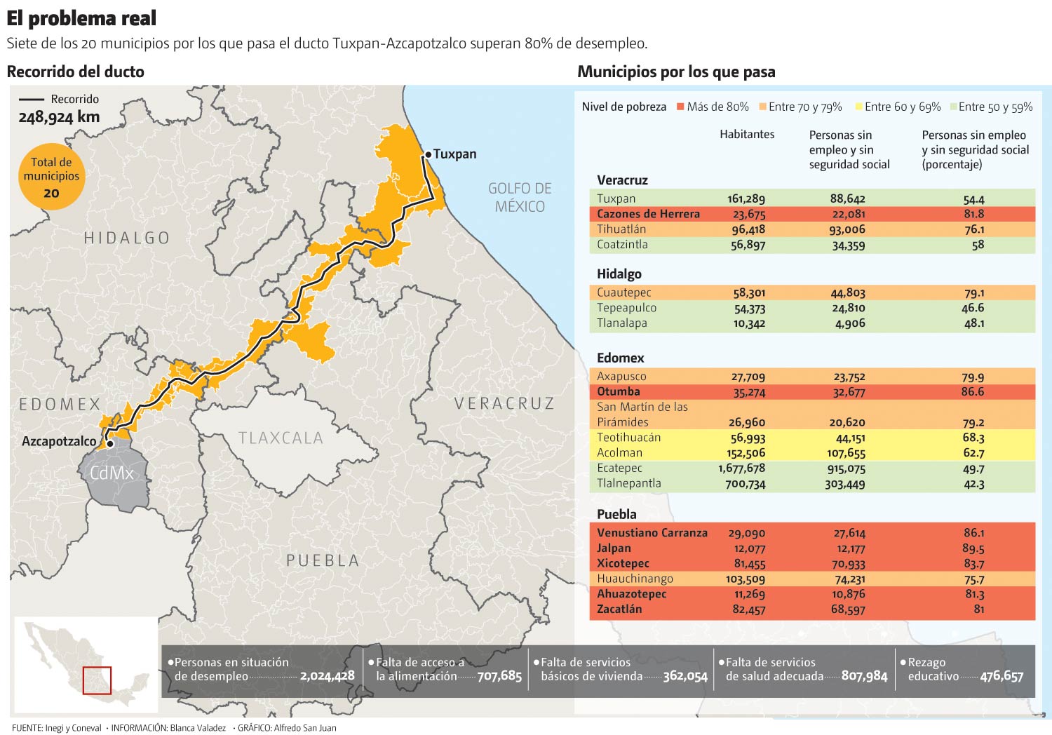 Cuando recorra los terrenos del huachicol esta semana, el presidente Andrés Manuel López Obrador se encontrará con un panorama desolador: en los 36 municipios que se hallan en la ruta del gasolinoducto Tuxpan-Azcapotzalco hay elevados índices de pobreza, falta de redes de protección social, desnutrición y, sobre todo, un fuerte desempleo entre jóvenes de 19 a 45 años.