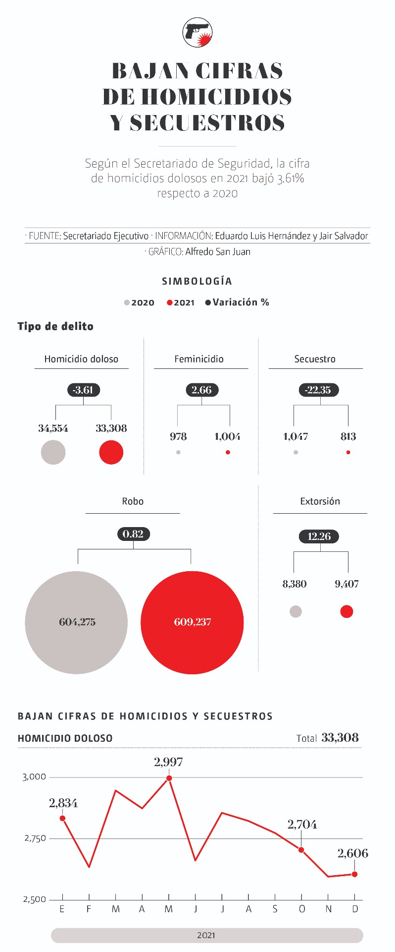 La secretaria señaló que se lograron reducir otros delitos, como los feminicidios en siete por ciento y la violencia intrafamiliar. De igual manera, del total de los delitos del fuero federal se logró una disminución de 32 por ciento, al pasar de nueve mil a seis mil, entre el arranque del actual gobierno y diciembre de 2021.