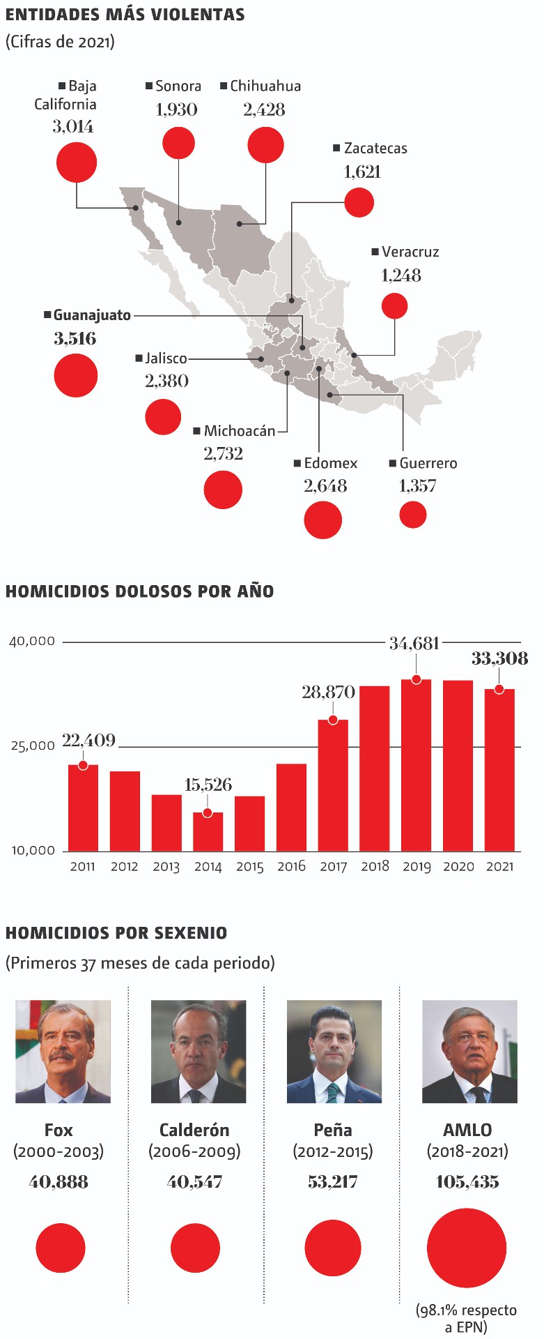 En la conferencia mañanera de Palacio Nacional, la funcionaria dio a conocer que los estados de Guanajuato, Baja California, Michoacán, Estado de México, Chihuahua y Jalisco concentran el 50 por ciento de los asesinatos registrados en el país. Mientras que a nivel municipal las regiones con peores índices son Cajeme, Sonora y Zamora, Michoacán.