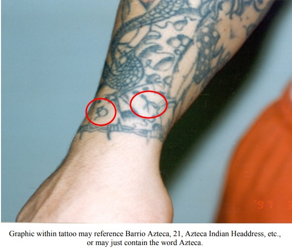 Los miembros de Barrio Azteca se identifican entre ellos a través de tatuajes. Generalmente contienen las letras B y A o el número 21, que corresponde a la representación numérica de las siglas de la pandilla. Otros incluyen el código de área de Texas, 915, y por cultura, alguna referencia a la cultura azteca.