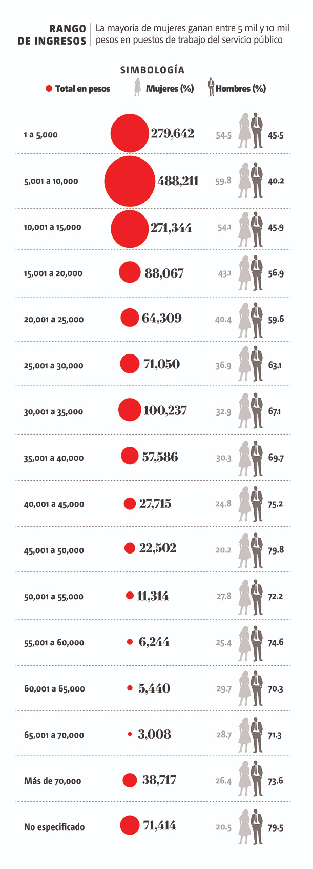 Actualmente hay 279 mil trabajadores públicos que perciben menos de 5 mil pesos mensuales y 55 por ciento de ellos son mujeres. En el siguiente estrato (5 mil 001 a 10 mil) laboran 488 mil burócratas y la población femenina sigue dominando con 60 por ciento.