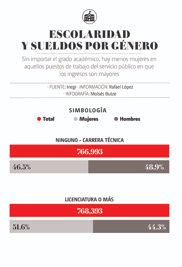 Contar con estudios universitarios o superiores no garantizan salarios competitivos a las mujeres que trabajan en la Administración Pública Federal, pues a pesar de que hay más servidoras públicas con licenciatura o posgrado, los varones siguen acaparando en gran medida los salarios más altos en la burocracia.