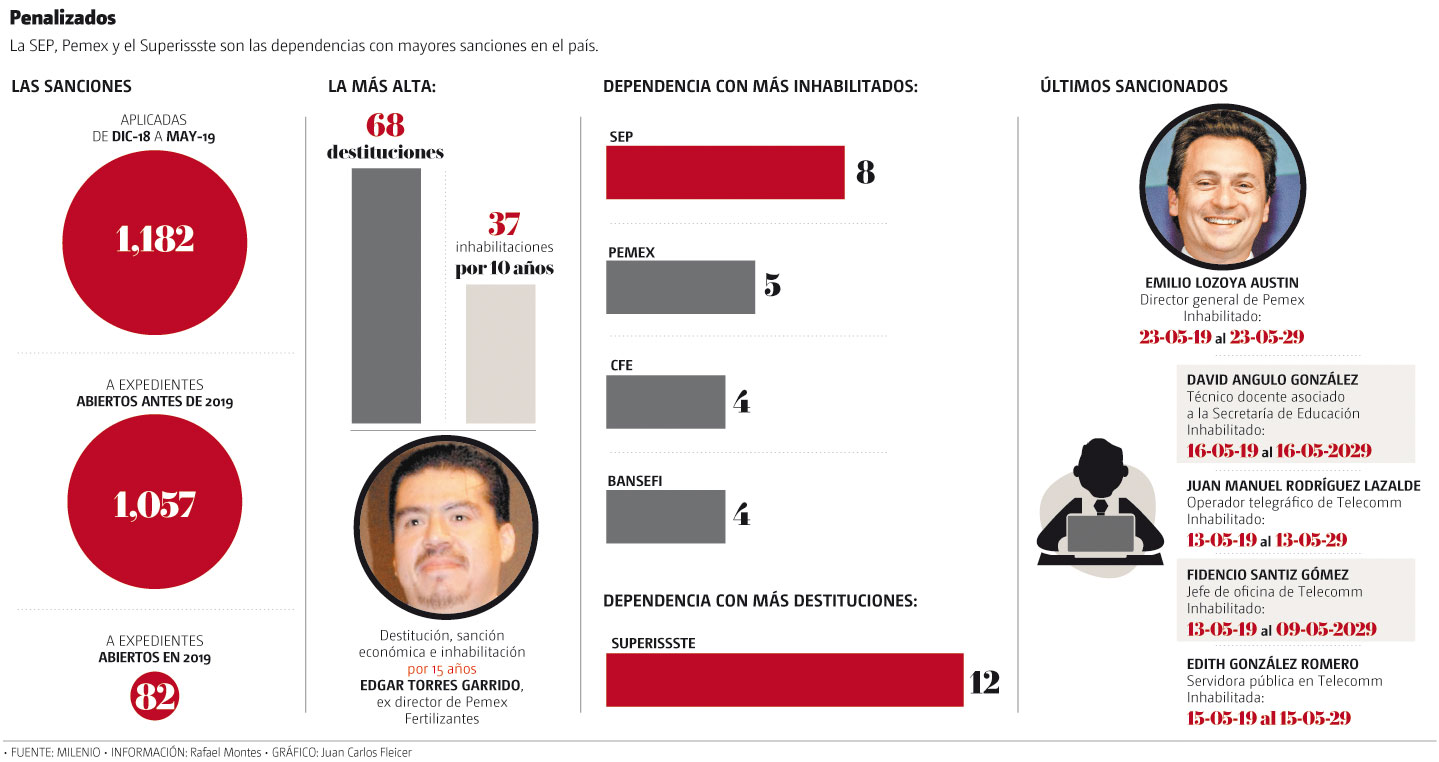 Entre diciembre de 2018 y mayo de 2019, la SFP ha impuesto mil 182 sanciones, desde destituciones hasta amonestaciones; las más altas que se han aplicado son 68 despidos, una inhabilitación por 15 años y 37 por 10 años a servidores y ex servidores públicos de diferentes dependencias federales.