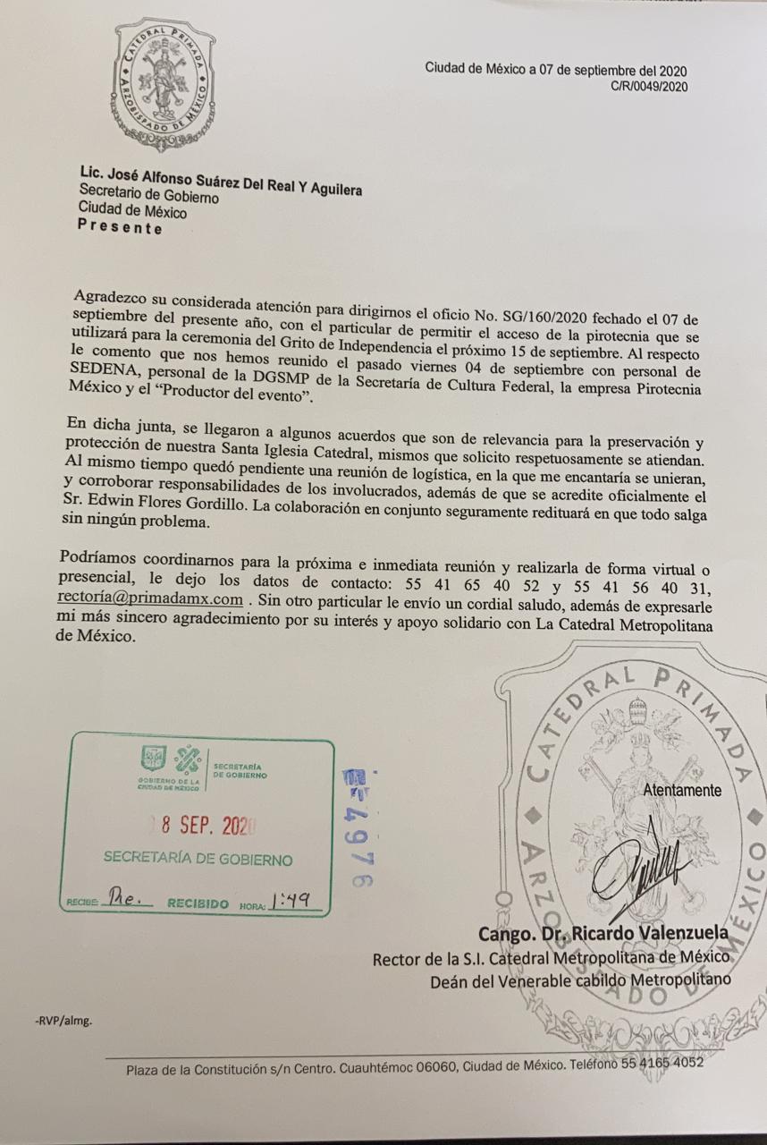 En la misiva, firmada por el rector de la Catedral, Ricardo Valenzuela, se invita a la Sedena y al gobierno capitalino a mantener la comunicación de cara a los festejos patrios.