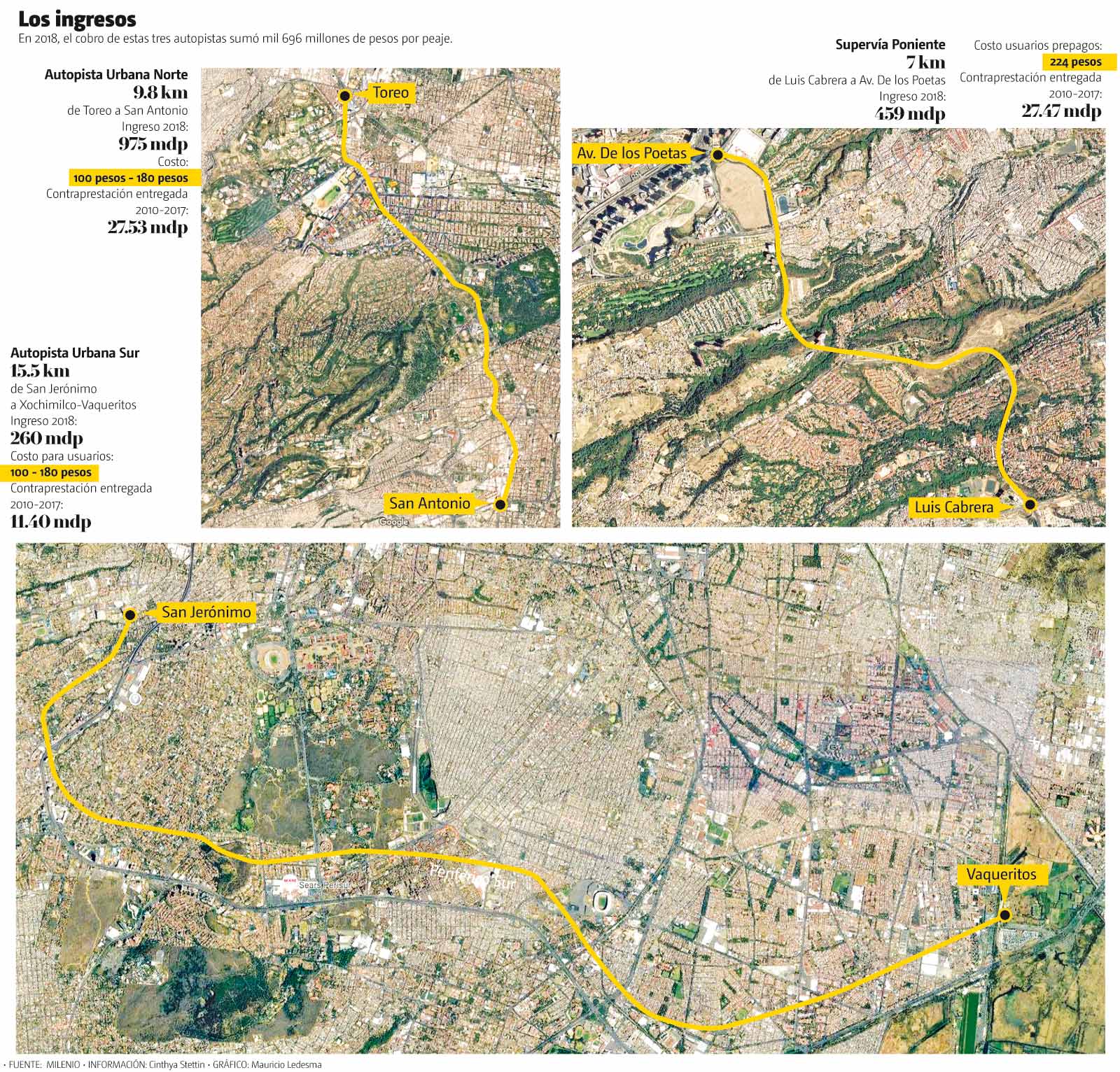 El negocio de las autopistas de peaje es bueno para las empresas, pero malo para el Gobierno de Ciudad de México: tan solo el año pasado las compañías que tienen las concesiones de la Autopista Urbana Sur, Autopista Urbana Norte y Supervía Poniente obtuvieron mil 696 millones de pesos por el cobro para transitar por ellas.