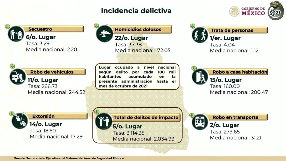 Así, se registraron disminuciones en la cifra de secuestro, los homicidios dolosos, la trata de personas, el robo a casa habitación, robo de vehículos, extorsión y robo en transporte público.