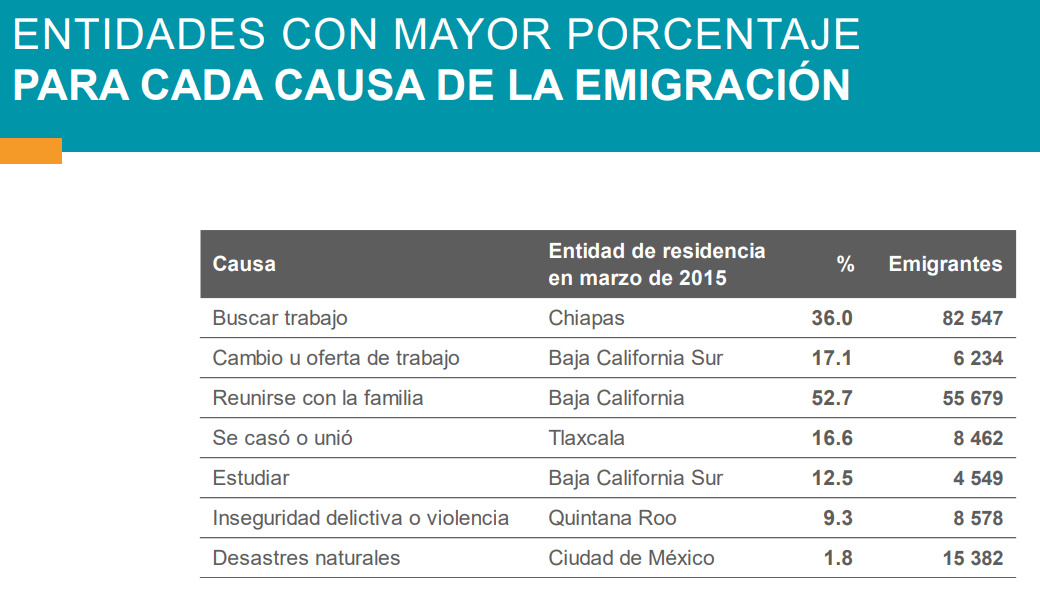 Entre los motivos que impulsan a los capitalinos a emigrar a otros estados, destaca principalmente el temor a los desastres naturales, sin embargo también lo hacen para reunirse con otros familiares, buscar trabajo, cambio de empleo, matrimonio, estudios e inseguridad.