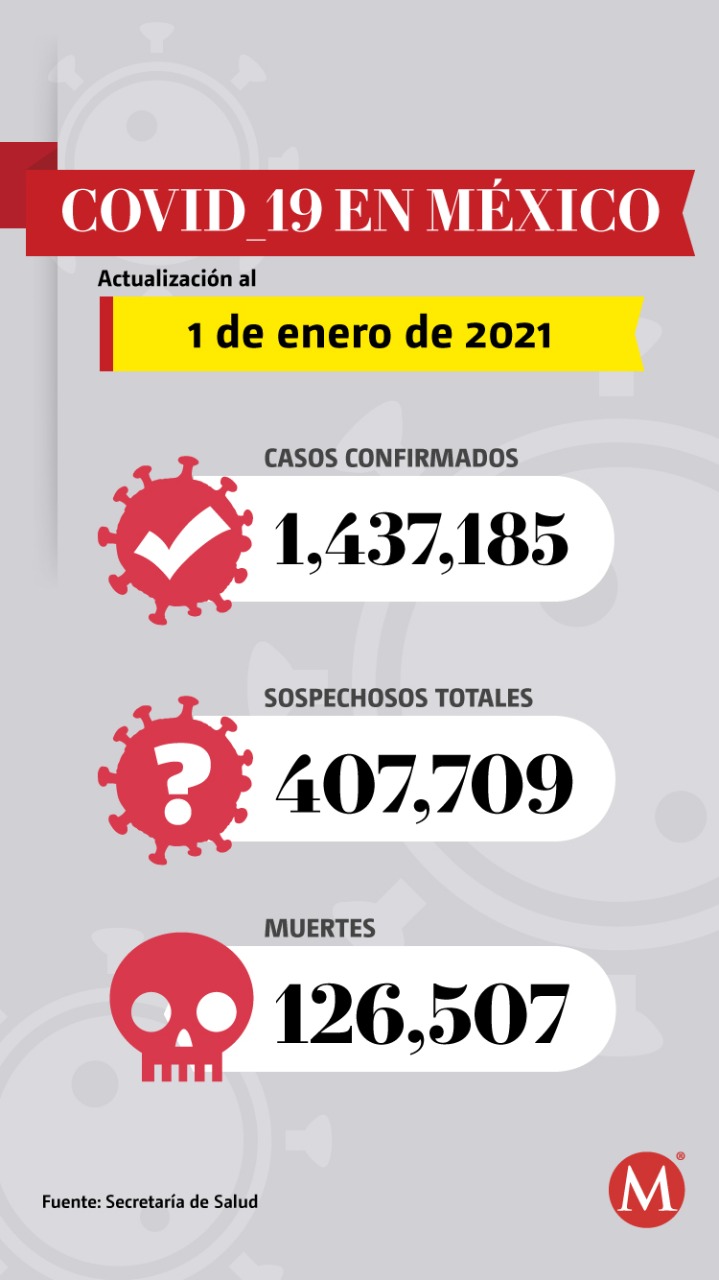 México suma 126 mil 507 muertes por covid-19 este viernes, de acuerdo con el reporte de la Secretaría de Salud que dio a conocer las cifras de la pandemia en el país al 01 de enero de 2021.