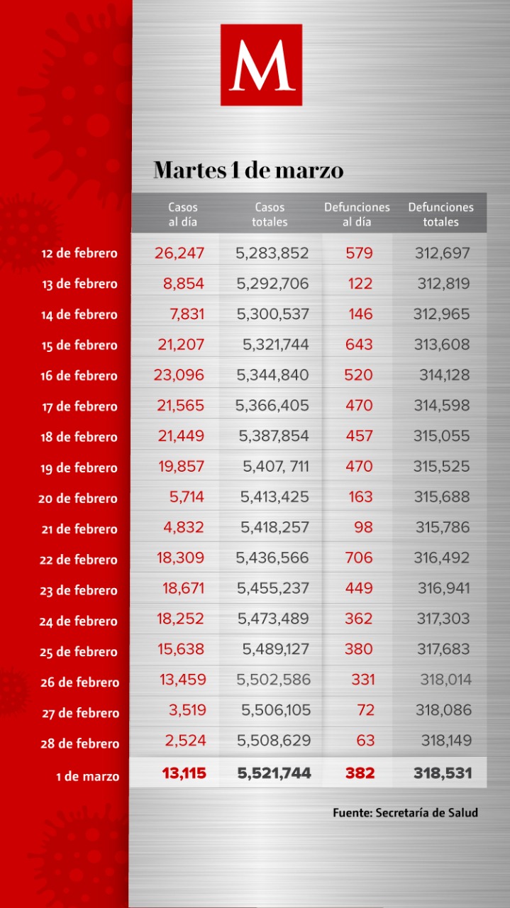 México inició el mes de marzo con 13 mil 115 nuevos casos de coronavirus y 382 muertes reportadas en las últimas 24 horas, con lo que se acumulan 5 millones 521 mil 744 contagios y 318 mil 531 defunciones desde el inicio de la pandemia en el país.