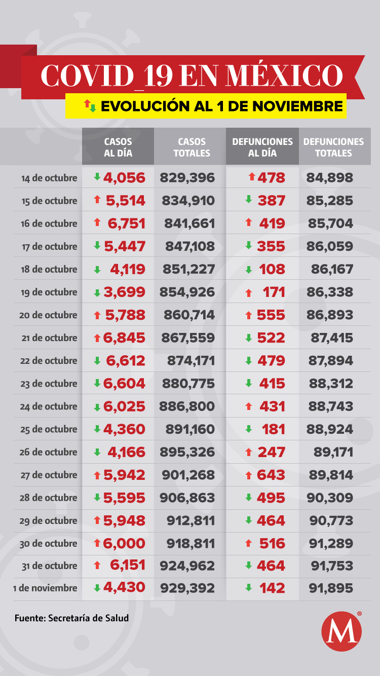 La Secretaría de Salud dio a conocer este domingo que México suma 91 mil 895 muertes por coronavirus SARS-Cov-2 y 929 mil 392 casos acumulados, de los cuales 1 millón 126 mil 280 son negativos y 354 mil 634 sospechosos.