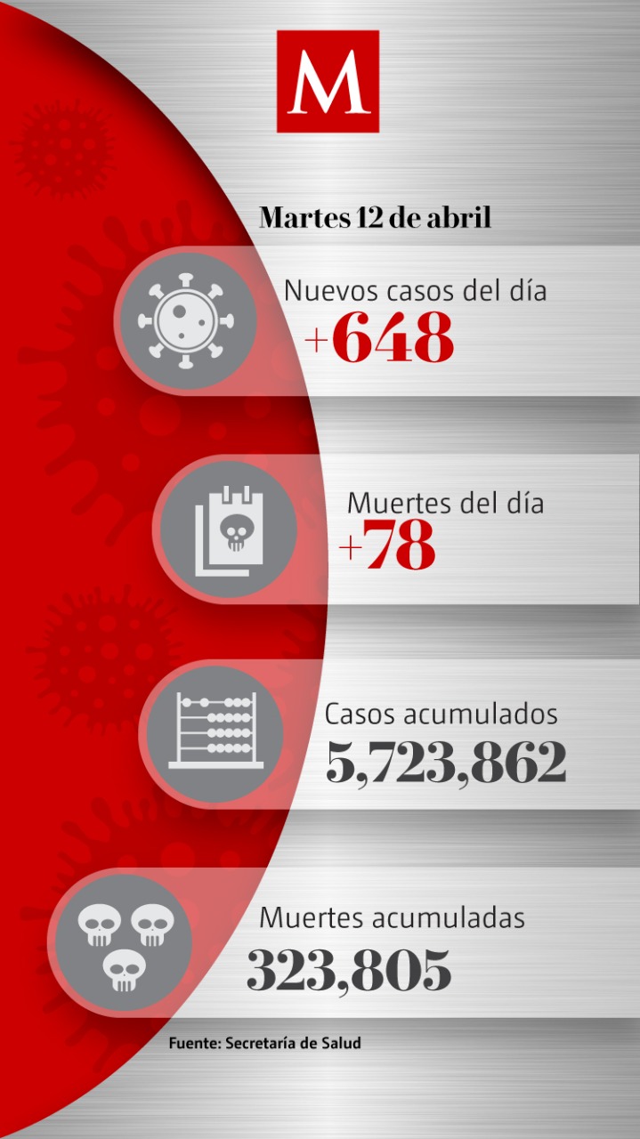 México sumó 78 nuevas muertes por coronavirus y 648 casos en las últimas 24 horas, con lo que se acumulan 323 mil 805 defunciones y 5 millones 723 mil 862 contagios, de acuerdo con el informe de la Secretaría de Salud.