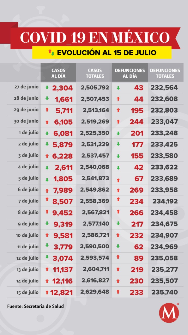 México registró 12 mil 821 nuevos contagios de coronavirus en 24 horas, para un total de 2 millones 629 mil 648 casos acumulados, así como 235 mil 740 muertes, 233 más que ayer, de acuerdo con el informe técnico de la Secretaría de Salud publicado este 15 de julio.