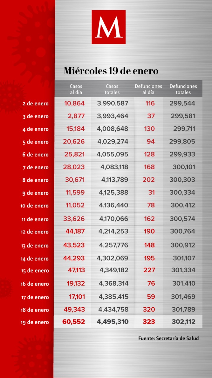México sumó 60 mil 552 nuevos casos de coronavirus y 323 muertes en las últimas 24 horas, con lo que se acumulan 4 millones 495 mil 310 contagios y 302 mil 112 defunciones, de acuerdo con el informe de la Secretaría de Salud.