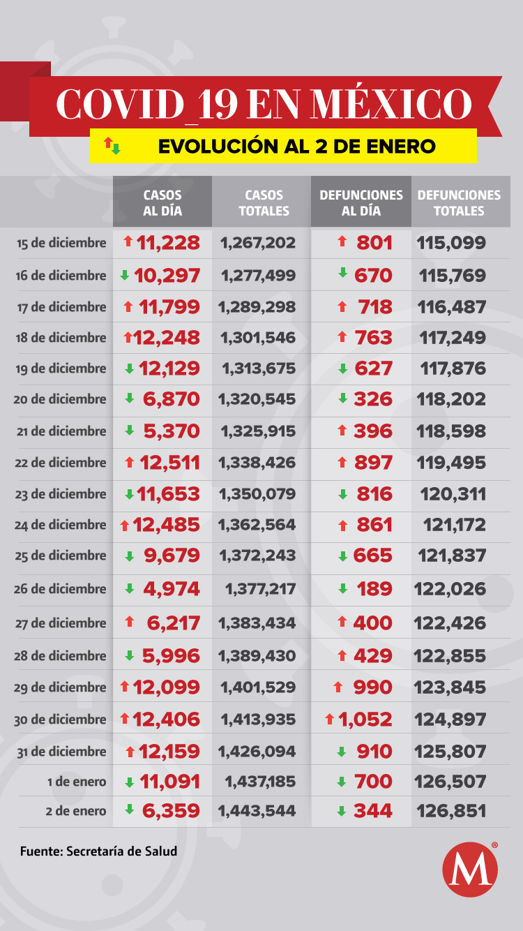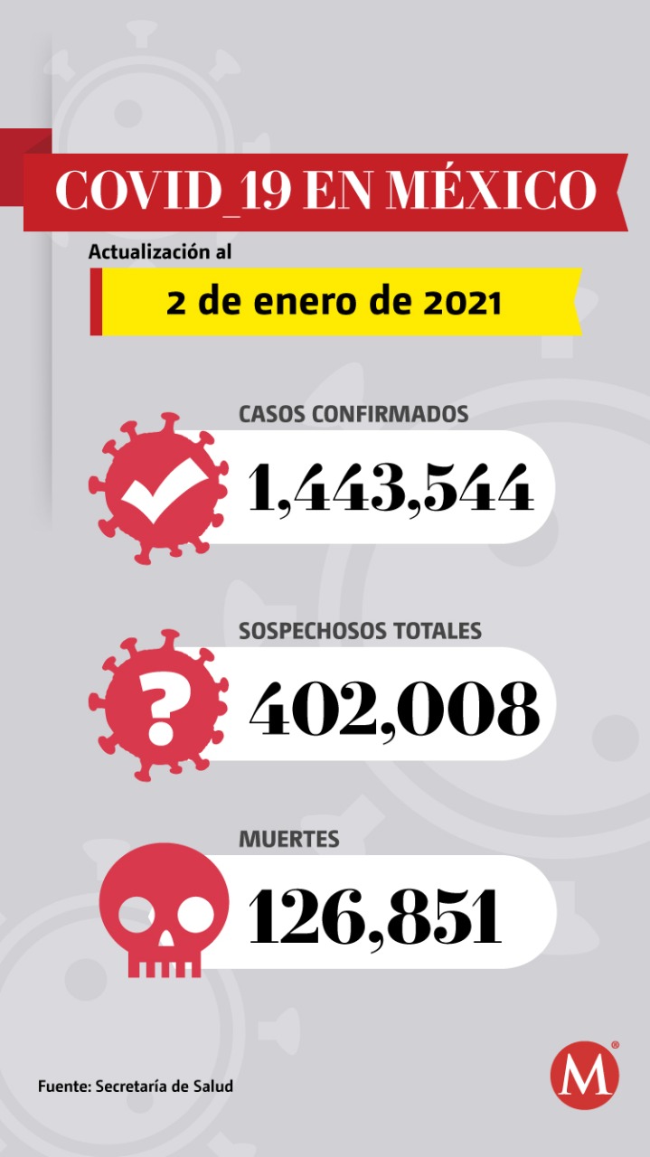Hoy México registró 126 mil 851 muertes por coronavirus SARS-CoV-2 y acumula un millón 443 mil 544 casos confirmados, de los cuales un millón 816 mil 687 son negativos; además se tienen 402 mil 8 casos sospechosos, informaron autoridades de la Secretaría de Salud.