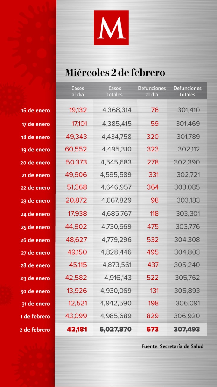 Fue el 4 de enero cuando México superó los 4 millones de contagios, al contabilizar 4 millones 8 mil 648 casos. En ese punto, el país acumulaba 299 mil 711 muertes por la enfermedad.
