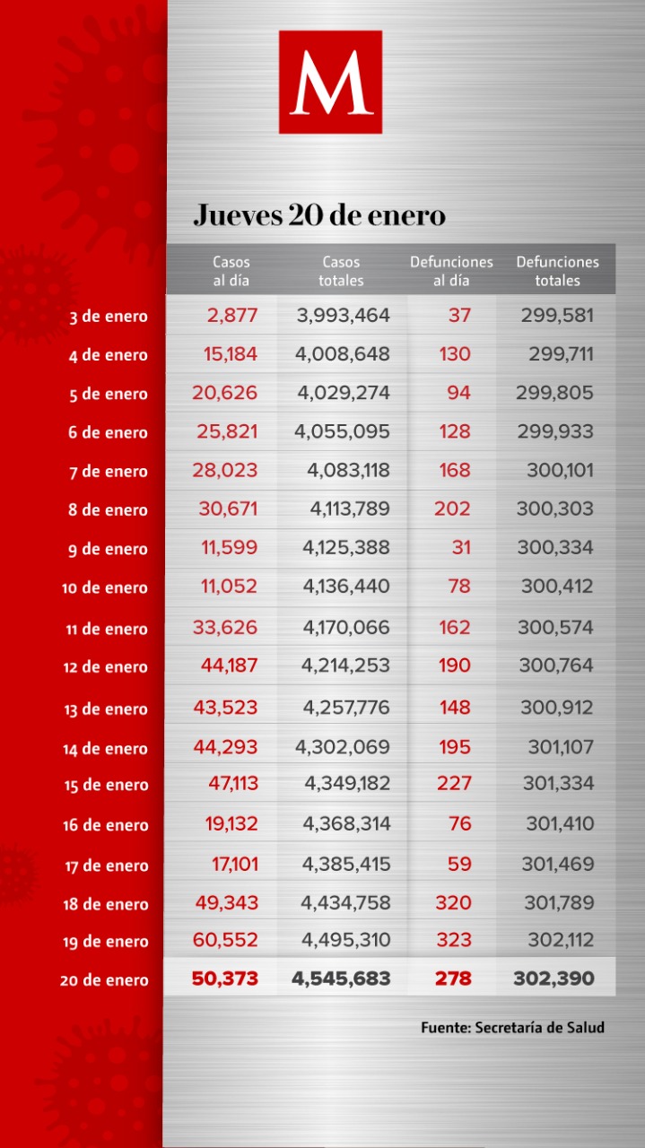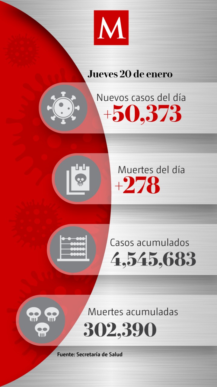México sumó 50 mil 373 nuevos casos de coronavirus y 278 muertes en las últimas 24 horas, con lo que se acumulan 4 millones 545 mil 683 contagios y 302 mil 390 defunciones, de acuerdo con el informe de la Secretaría de Salud.