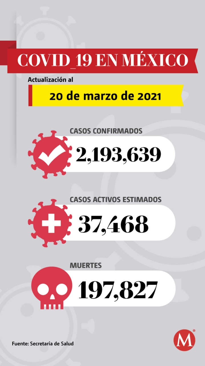 México registró 608 nuevas muertes de covid-19 en un solo día, de acuerdo con el reporte de la Secretaría de Salud que dio a conocer las cifras de la pandemia en el país al 20 de marzo de 2021.