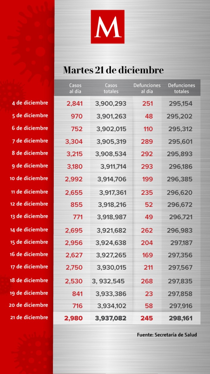En las últimas 24 horas, México sumó 2 mil 980 nuevos casos de coronavirus y 245 muertes, con lo que se acumulan 3 millones 937 mil 82 contagios y 298 mil 161 defunciones, de acuerdo con el informe de la Secretaría de Salud.