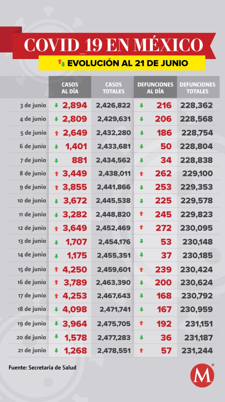 México suma 231 mil 244 muertes por coronavirus SARS-CoV-2 y registra dos millones 478 mil 551 casos confirmados acumulados, de acuerdo al informe técnico de la Secretaría de Salud.