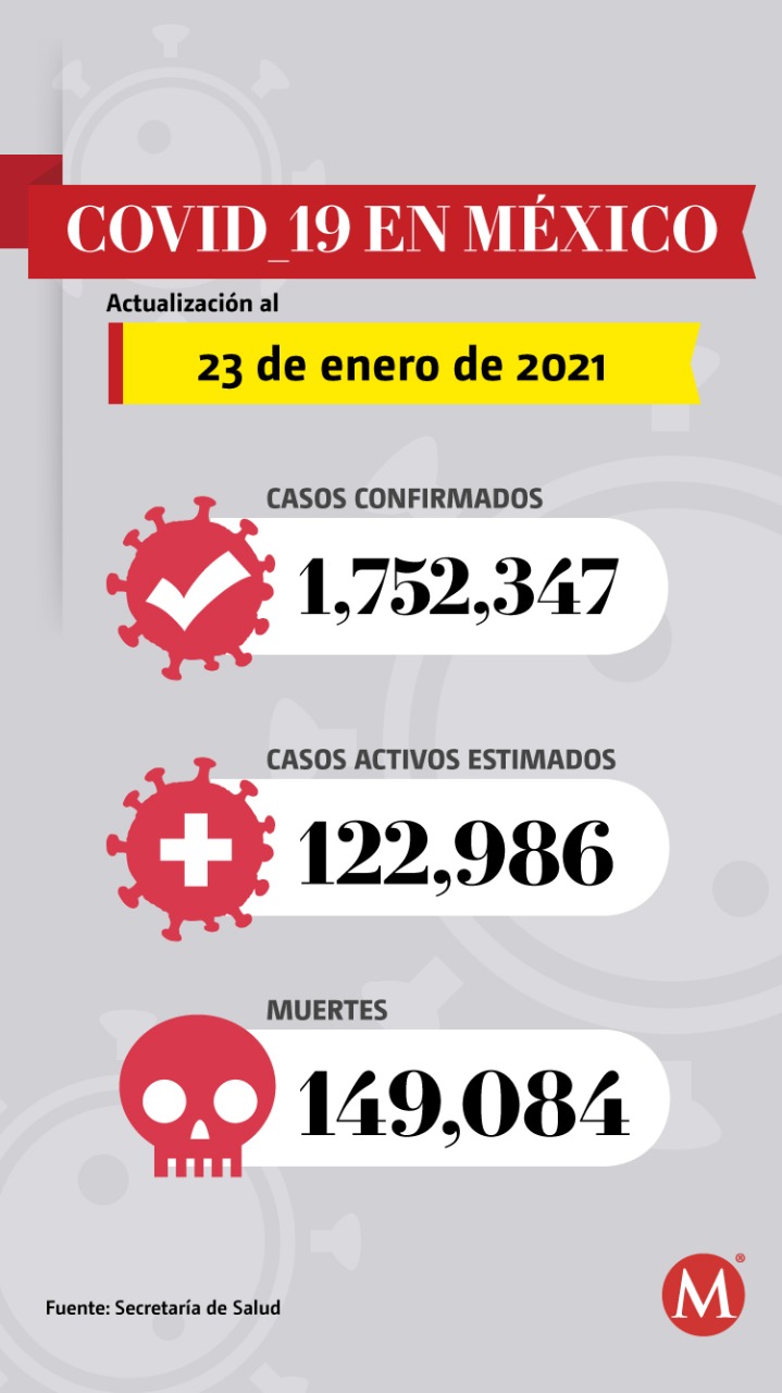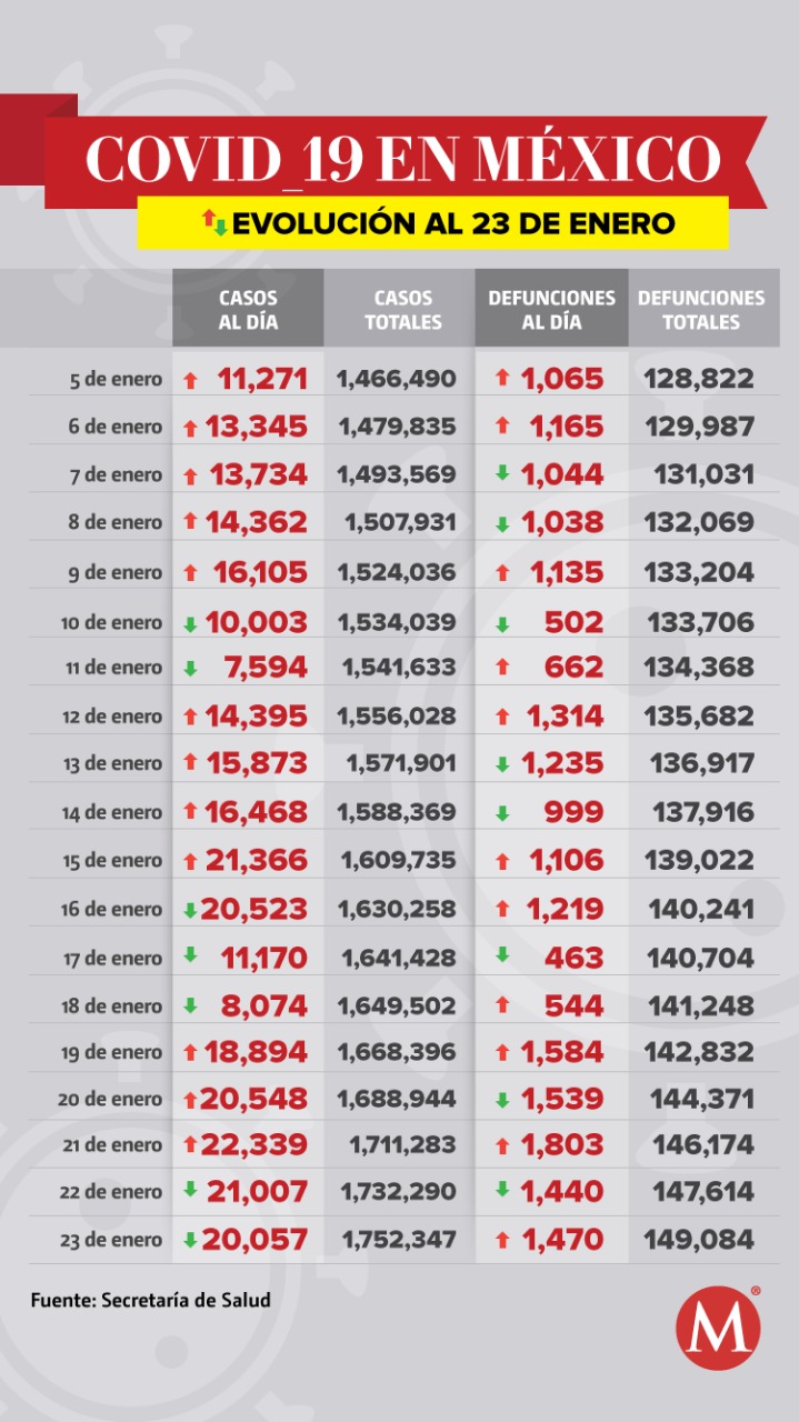 México registró mil 470 nuevas muertes y 20 mil 57 nuevos casos de covid-19 este sábado, de acuerdo con el reporte de la Secretaría de Salud que dio a conocer las cifras de la pandemia en el país al 23 de enero.