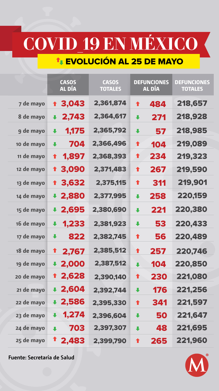 México acumula 221 mil 960 muertes por coronavirus, 265 decesos más que ayer, de acuerdo con el informe diario de la Secretaría de Salud presentado este martes 25 de mayo por José Luis Alomía, director general de Epidemiología.