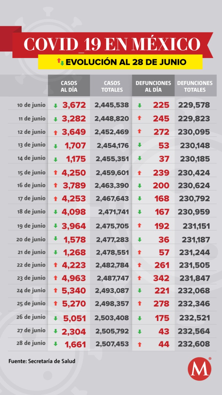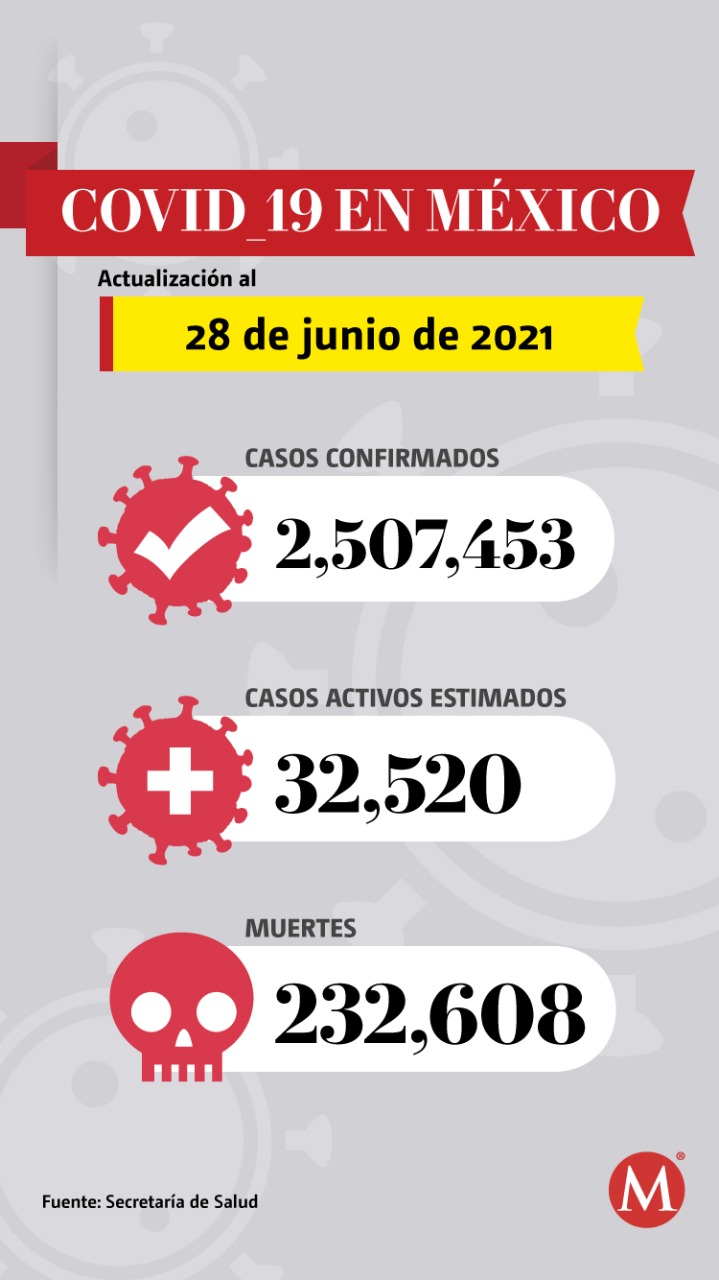 México suma 232 mil 608 muertes por coronavirus SARS-CoV-2, 44 más que ayer; además, registra 2 millones 507 mil 453 casos acumulados, de acuerdo al informe técnico de la Secretaría de Salud dado a conocer este lunes.