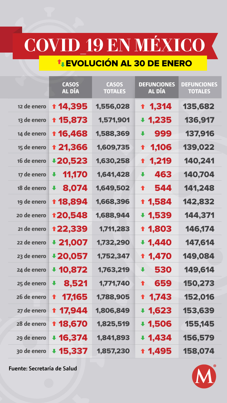 México suma mil 495 nuevas muertes por covid-19 en un solo día, de acuerdo con el reporte de la Secretaría de Salud que dio a conocer las cifras de la pandemia en el país al 30 de enero.