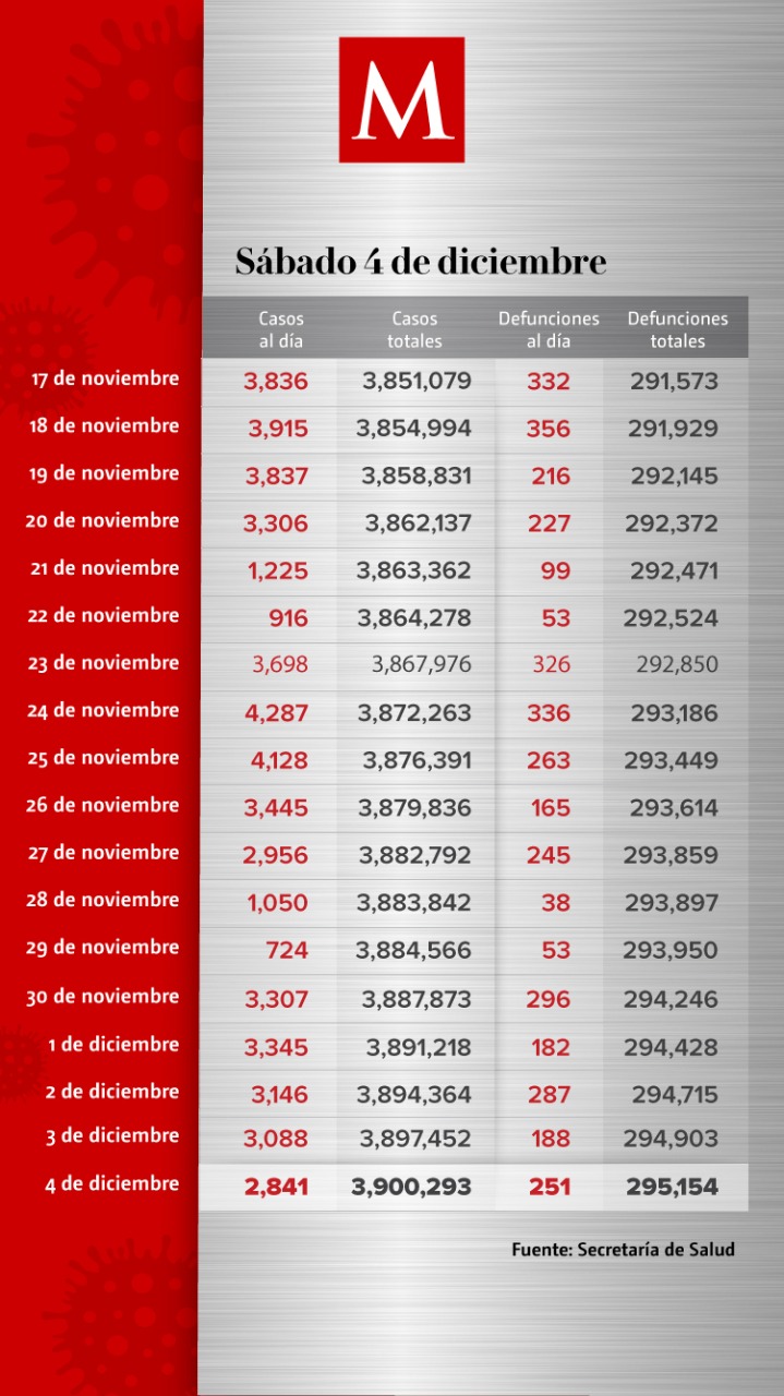 México suma 295 mil 154 muertes por covid-19 y registra 3 millones 900 mil 293 casos acumulados de coronavirus SARS-CoV-2, de acuerdo con el informe técnico de la Secretaría de Salud publicado este viernes en el que se añadieron 251 muertes y 2 mil 841 nuevos casos en 24 horas.
