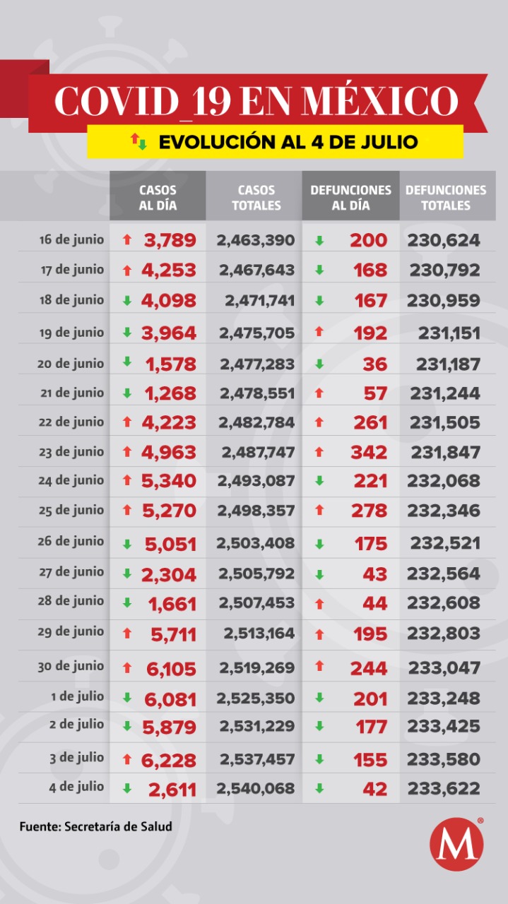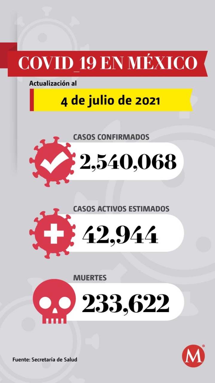 México suma 233 mil 622 muertes por coronavirus SARS-CoV-2 y acumula 2 millones 540 mil 68 casos acumulados, de acuerdo al informe técnico dado a conocer por la Secretaría de Salud.