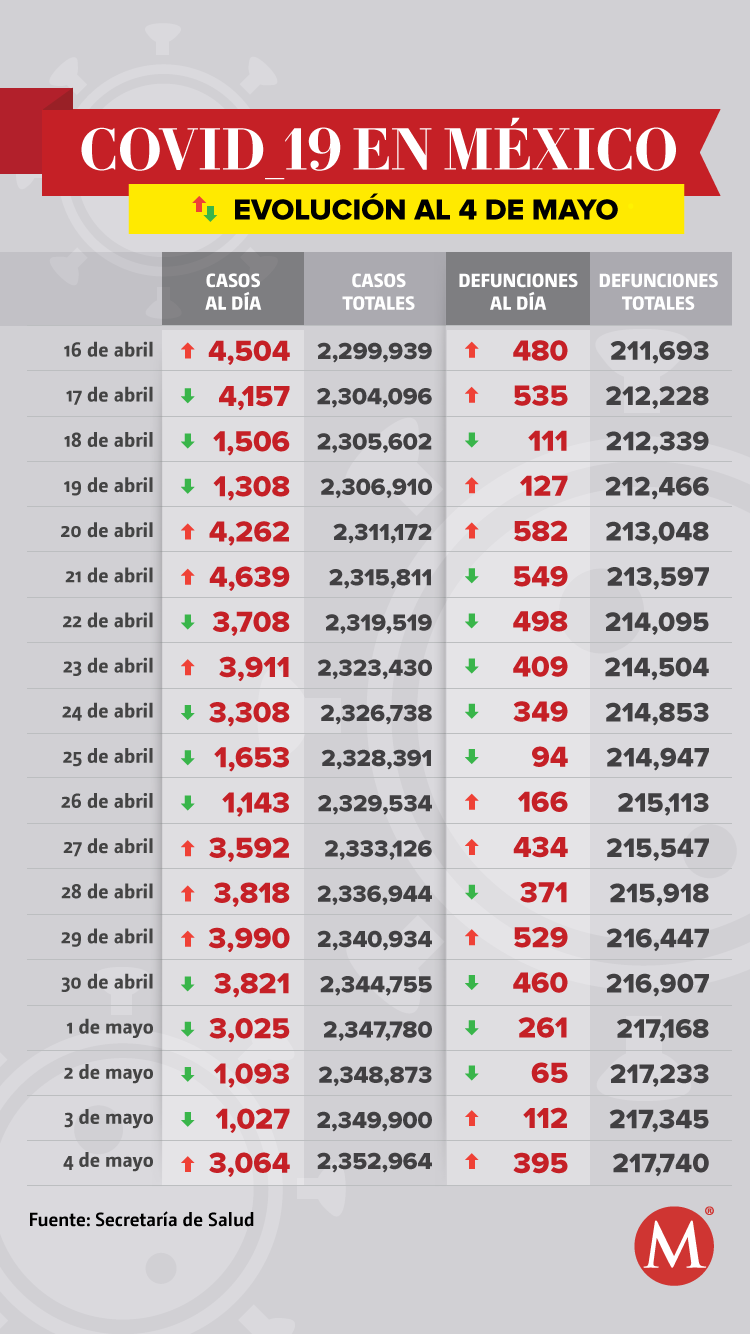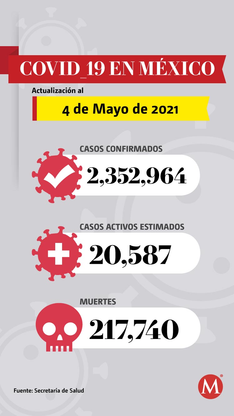 México suma 217 mil 740 muertes por coronavirus SARS-CoV-2 y 2 millones 539 mil 819 casos estimados, de acuerdo al informe de la Secretaría de Salud dado a conocer por José Luis Alomía, director general de Epidemiología.