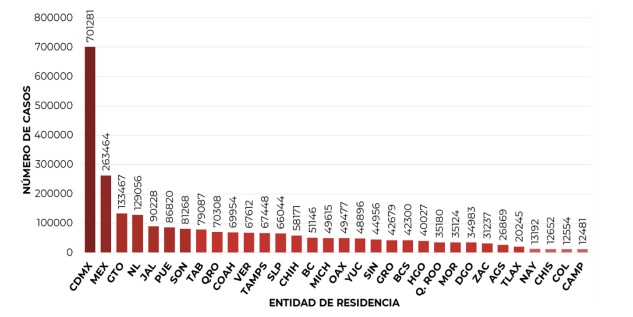 Los casos confirmados acumulados los engloban principalmente diez estados, los cuales, en conjunto, conforman más de dos tercios de todos los contagios en el país, es decir, el 66 por ciento. Las entidades son: