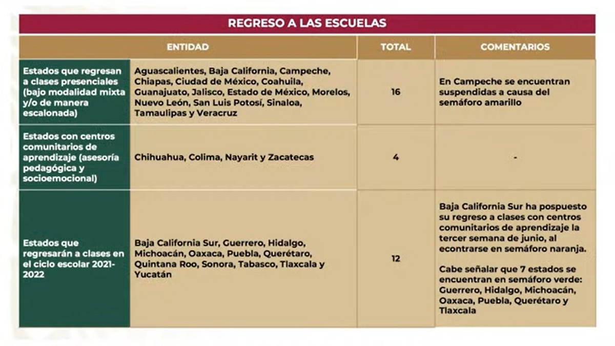 No obstante en Campeche, estado donde se realizó la etapa piloto del plan para regreso a clases presenciales, actualmente éstas se encuentran suspendidas a causa del semáforo amarillo.
