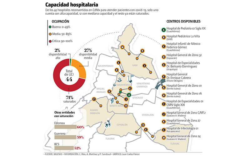 En Ciudad de México solo hay un hospital con buena disponibilidad de camas en las Unidades de Cuidados Intensivos (UCIS) para atender a pacientes con covid-19; de los 44 hospitales destinados a la atención de contagiados, 12 tienen disponibilidad media, uno alta y 31 ya están saturados.