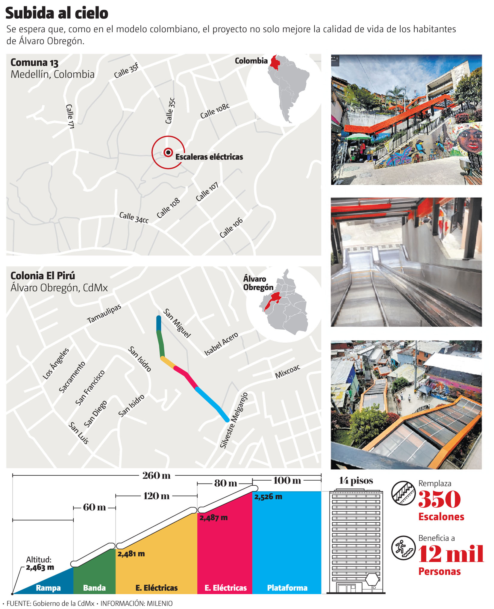 Ahora, ese proyecto se alista en Ciudad de México, pero combinará escaleras con bandas deslizadoras en la colonia El Pirú, en Álvaro Obregón, al cual la alcaldesa, Layda Sansores, quien ya visitó Medellín para conocer la obra, lo califica como “un sueño”.