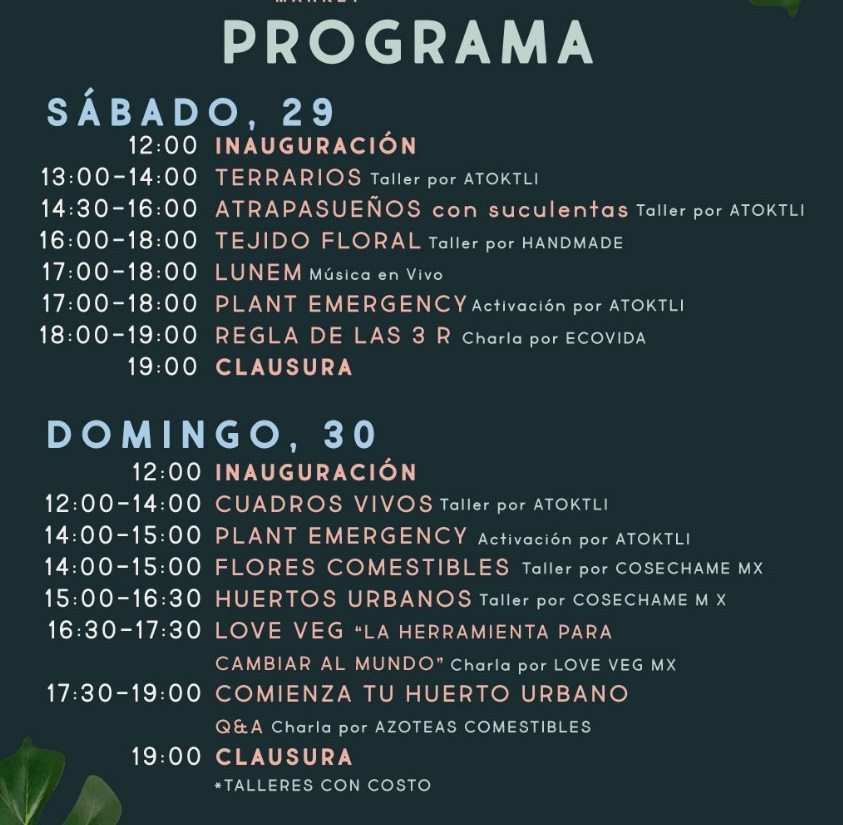 Esta edición contará con talleres como terrarios, huertos urbanos, flores comestibles entre otros, presentación de un amplio menú gastronómico, música en vivo así como compra venta de herramientas, productos de jardinería, plantas y habrá pláticas con especialistas del tema para adentrarse de lleno al mundo de las plantas, sus cuidados, especies, características; que podrán implementar en la vida diaria.