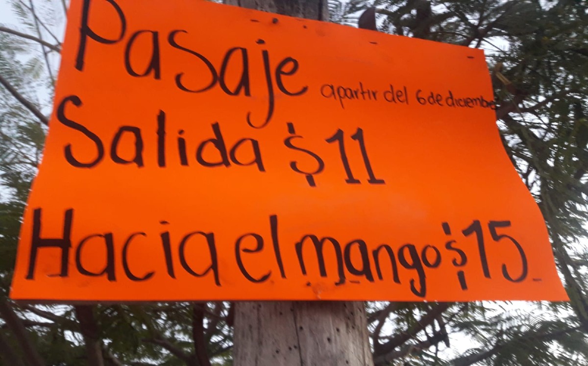 Con una cartulina fosforescente avisan a vecinos del Fraccionamiento "Unidos Avanzamos" de Altamira del aumento al pasaje, a partir del seis de diciembre.