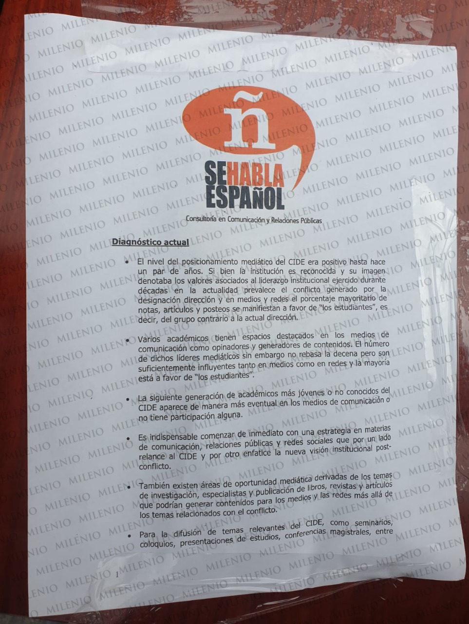 El documento realiza un diagnóstico actual del CIDE en el que encuentra que: "El nivel del posicionamiento mediático del CIDE era positivo hasta hace un par de años. Si bien la institución es reconocida y su imagen denotaba los valores asociados al liderazgo institucional ejercido durante décadas, en la actualidad prevalece el conflicto generado por la designación dirección y en medios y redes el porcentaje mayoritario de notas artículos y posteo se manifiestan a favor de 'los estudiantes', es decir del grupo contrario a la actual dirección".