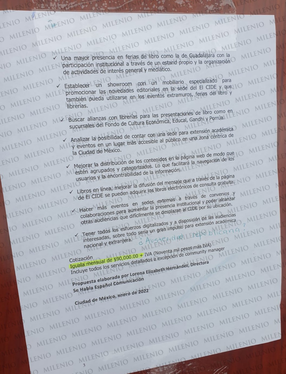 "Iguala mensual de $90,000.00 + IVA. Incluye todos los servicios de tallados a excepción de community manager. Propuesta elaborada por Lorena Elizabeth Hernández, directora de Se habla español comunicación", finaliza con fecha de enero 2022.